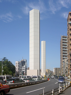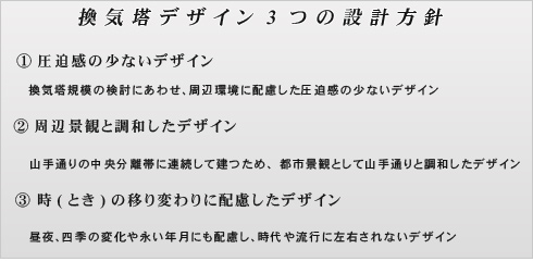 これにより、周辺住民の方々に末永く受け入れられるデザインを実現しました。(最終的に7箇所の地下換気所と高さ45mの換気塔が14本、山手通りの中央分離帯に建設され、そのうち当社は3箇所7本の設計を担当しました。)