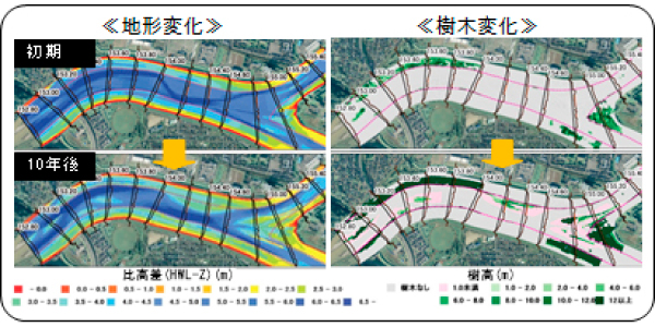 砂州掘削、樹木伐採後の地形変化、樹木分布シミュレーションの例