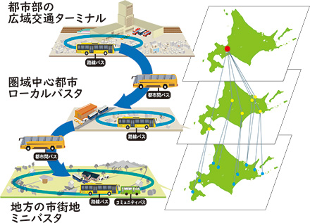 地域特性に応じた公共交通の階層的なネットワークの形成や交通結節点の整備に向けた検討および自動運転などの新しい移動手段の導入、次世代対応型の交通結節点の導入を検討し、社会実験を通じた社会実装に取り組んでいます。