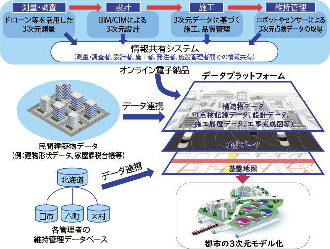 計画・設計・施⼯・維持管理といった建設プロセス全体を効率的なものに変化させようとしています。建設プロセスで⽣成される3次元点群データ、3次元設計データや気象や舗装状態、冬期路⾯状況などの様々なビッグデータをプラットフォームに格納し、道路の舗装状態管理、冬期の除排雪の効率化などの道路管理の⾼度化に向けて取り組んでいます。