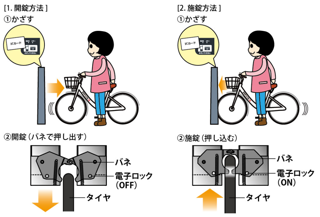 サイクルシェアなどで利用されるIT技術を組み合わせた駐輪システムです。 省力化に配慮し、バネと二枚のブレードを組み合わせた駐輪装置(ロックシステム)で自転車等の車輪を施錠、開錠します。ICカードの認証機能と連動して、押込み、押出しで簡単に利用できます。